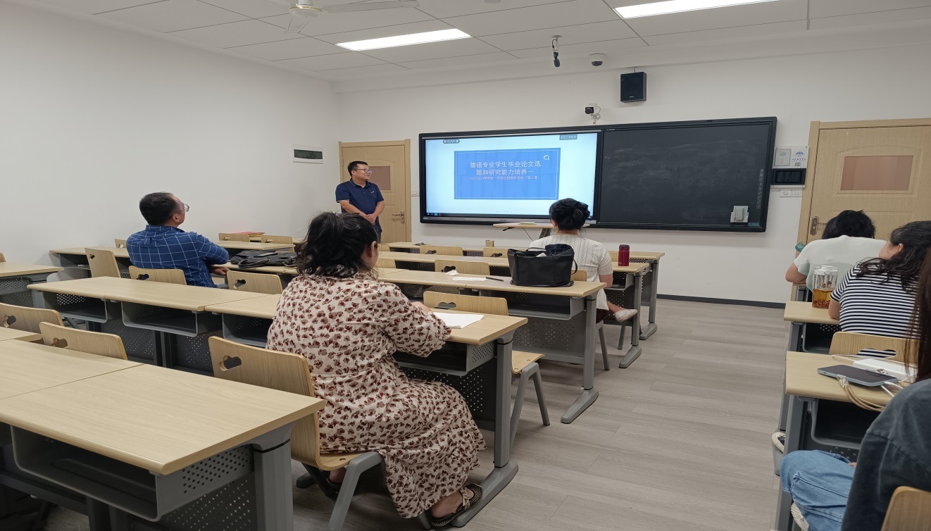 为进一步促进2024届本科毕业论文的教学管理,规范本科毕业论文的质量,9月13日,德语教研室召开了题为“本科毕业论文选题和研究能力培养”教研会。德语系教师围绕2024届毕业论文开题报告、任务书、开题答辩以及往届论文指导工作中出现的问题展开研讨。研讨会由德语系主任王勃主持。