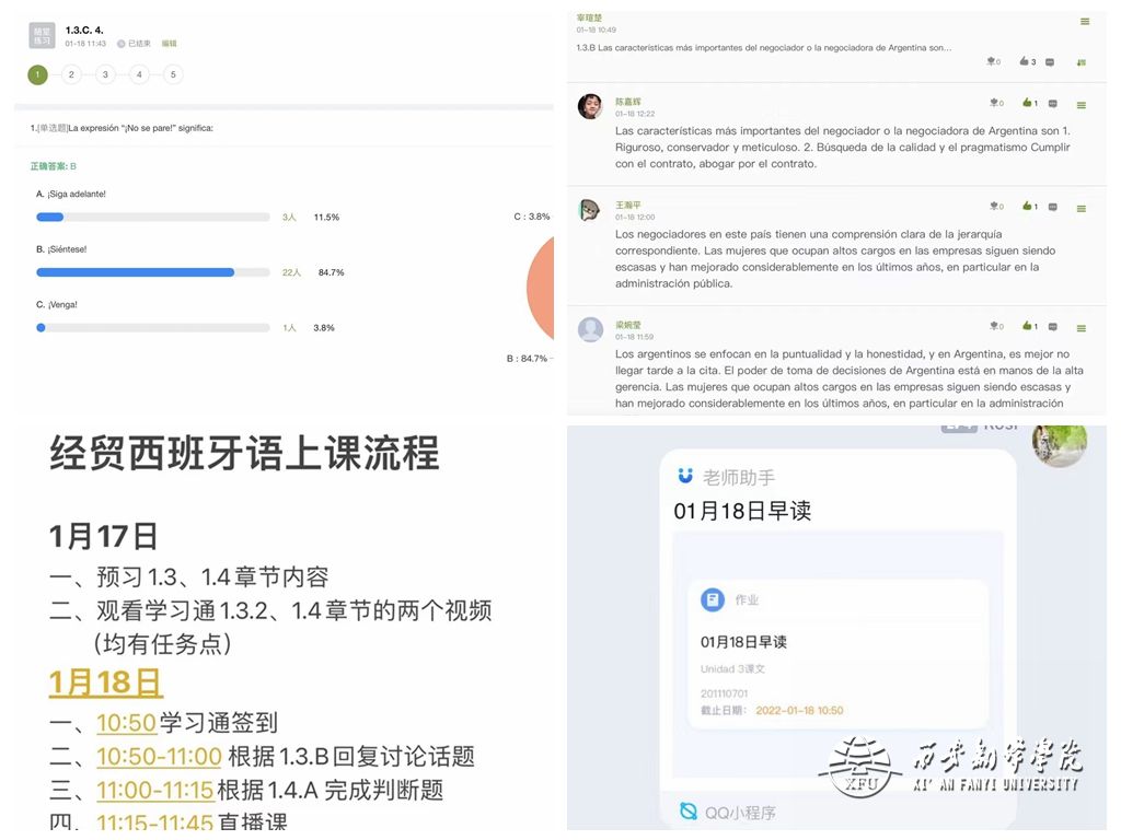 近日,pp电子游戏平台官网西班牙语专业课程第二周线上教学圆满结束。在总结前期授课过程中遇到的问题的基础上,西班牙语教研室各专业老师本周继续整合课程资源、灵活调整教学方案,采取将部分学习任务安排至课前,以录播+练习+直播答疑等方式开展线上教学,亮点突出,效果显著。