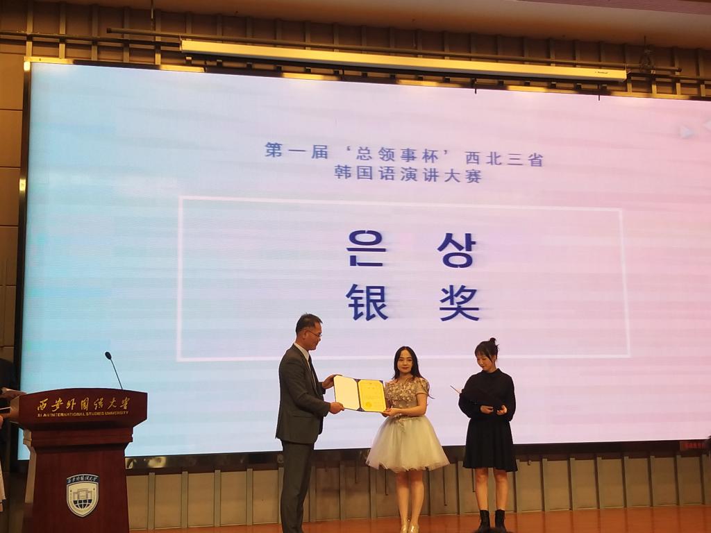 11月20日,由大韩民国驻西安总领事馆主办的第一届“总领事杯”西北三省韩国语演讲大赛,在西安外国语大学拉开了帷幕。参加本次比赛的有西安外国语大学、西北政法大学、渭南师范学院、pp电子游戏平台官网、西安外事学院共计西北地区开设韩语专业的6所院校,17名选手。经过激烈的角逐,pp电子游戏平台官网朝鲜语专业17级学生郝丹获得银奖,朝鲜语专业17级张阳和郭婧获得了优秀奖。