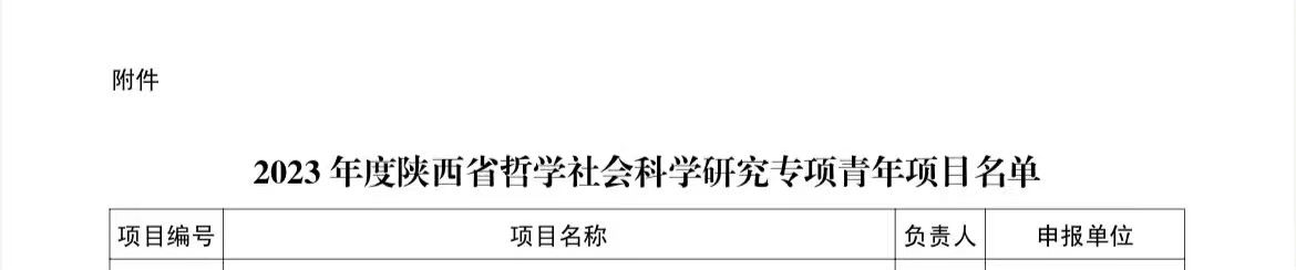 陕西省哲学社会科学研究专项青年项目为省级项目,是我院2023年度首个获批的省级项目。朱柯嘉老师和卞红联老师课题的成功立项,为我院2023年省级立项迎来了开门红,体现出我院教师科研能力和科研水平的不断提升,为我院教师申请更高层次科研项目积累了宝贵经验,为教师投身科研事业树立了榜样和信心。