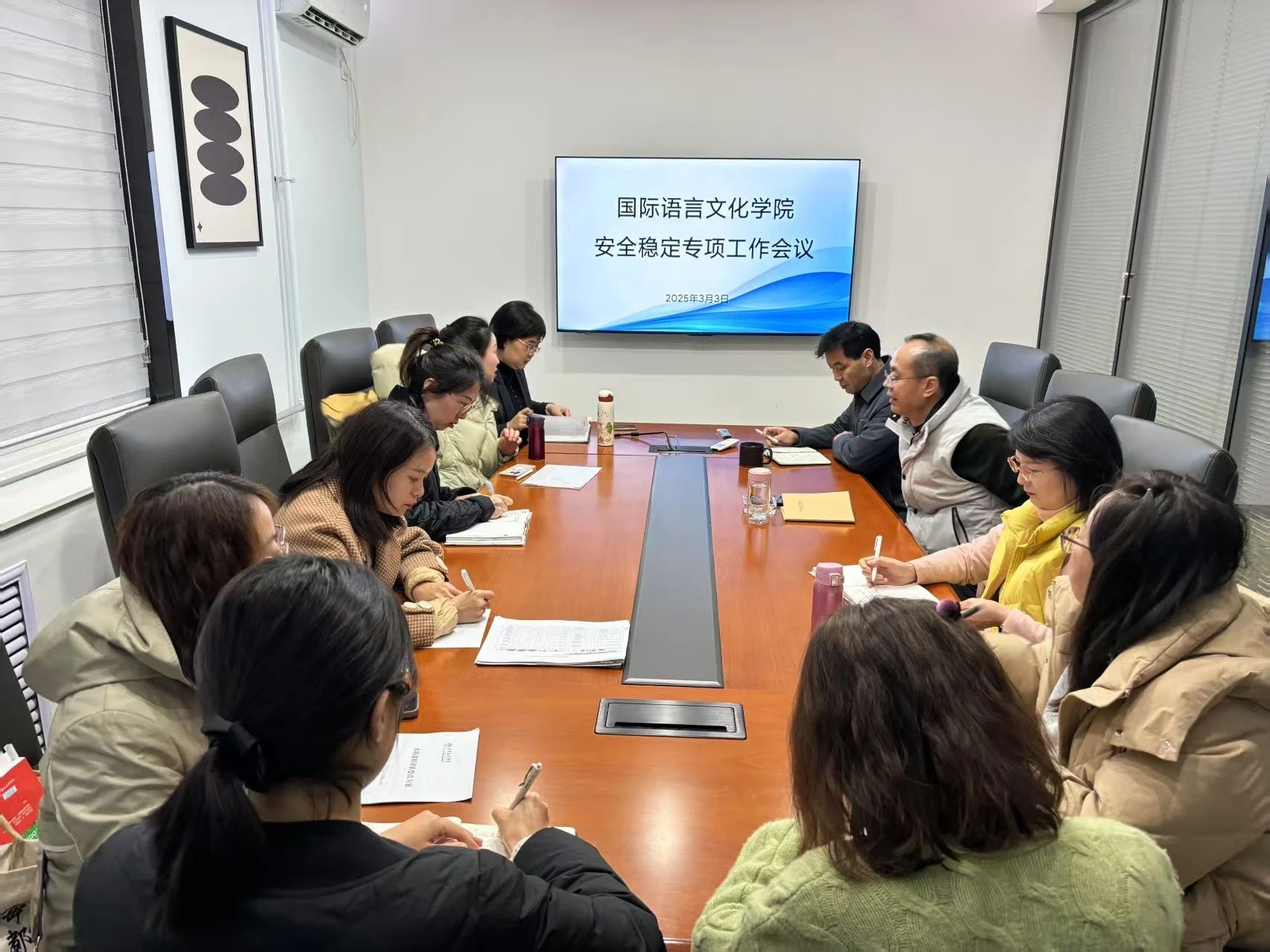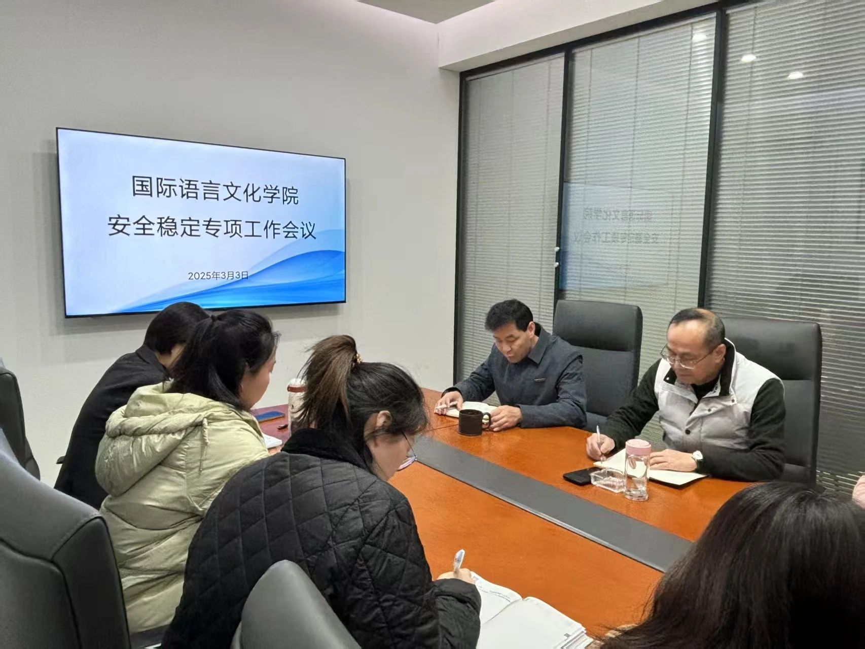 为深入贯彻落实学校安全稳定工作会议精神,切实维护校园安全稳定,3月3日下午,国际语言文化学院召开安全稳定专项工作会议。学院院长李庆明,党委书记、副院长宇文永康,副院长吴震、魏海燕及各系办主任参会。