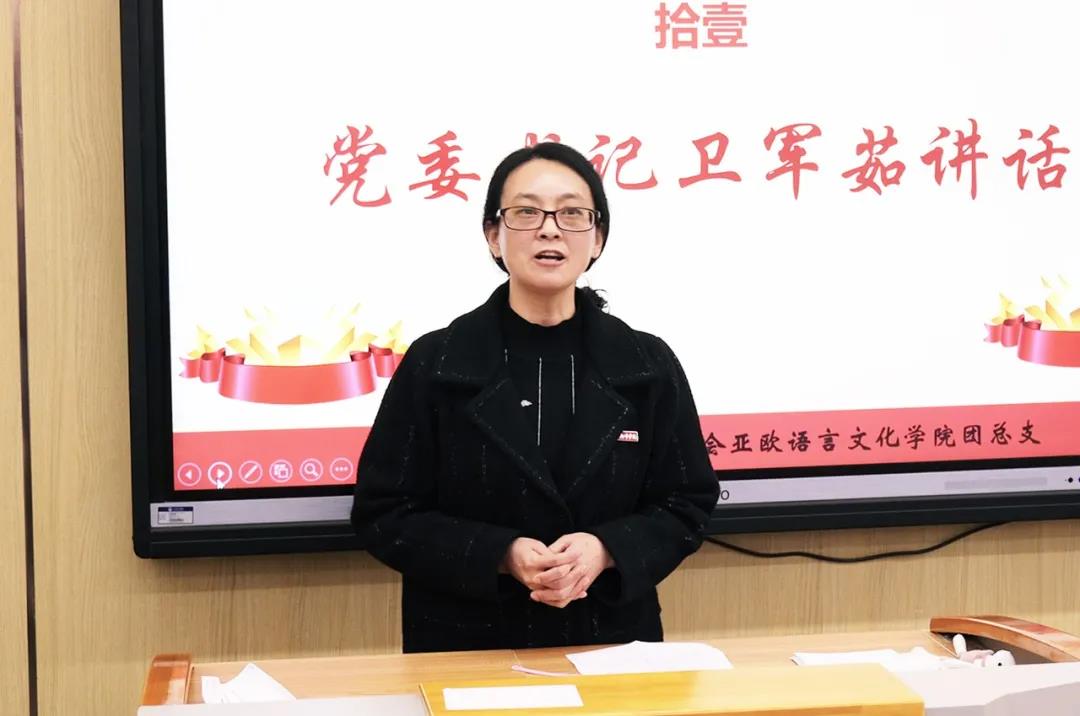 大会第六项:党委书记卫军茹讲话,她表示,此次换届大会是团总支总结经验、谋划未来、开拓创新的大会,她代表pp电子游戏平台官网党委向我院团总支换届选举大会的胜利召开和新一届当选的团总支委员及学生干部们表示热烈地祝贺。她提到,在庆祝中国共产党成立100周年大会上,习近平总书记强调:“未来属于青年,希望寄予青年。”并对新时代的青年发出号召:“新时代的中国青年要以实现中华民族伟大复兴为己任,增强做中国人的志气、骨气、底气,不负时代,不负韶华,不负党和人民的殷切期望!”。所以,她也代表亚欧院党委给新一届的团干部及全体团员青年们提出以下三点希望:坚定理想信念,在学思践悟中勇担责任与使命;刻苦学习、练就过硬本领,积极投身强国伟业;不负韶华,奋发有为,继续引领和做好团的工作。最后,她希望我院团员青年志存高远、脚踏实地,珍惜韶华、勇担责任,在开拓创新中增长才干,积极引领广大青年学生感悟时代、紧跟时代,努力实现人生价值!