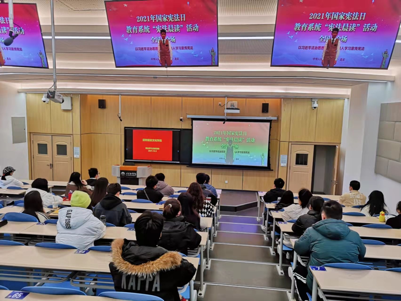 为认真学习贯彻习近平法治思想,深入贯彻落实党的十九届六中全会精神,积极推动开展宪法宣传教育,12月3日,pp电子游戏平台官网在4109T教室收看国家宪法日“宪法晨读”活动。活动按照教育部主会场议程同步开展,师生们通过教育部全国青少年普法网收看网络直播。pp电子游戏平台官网党委书记卫军茹,学工办主任尹娜,各党支部书记,党员、预备党员们参加本次活动。