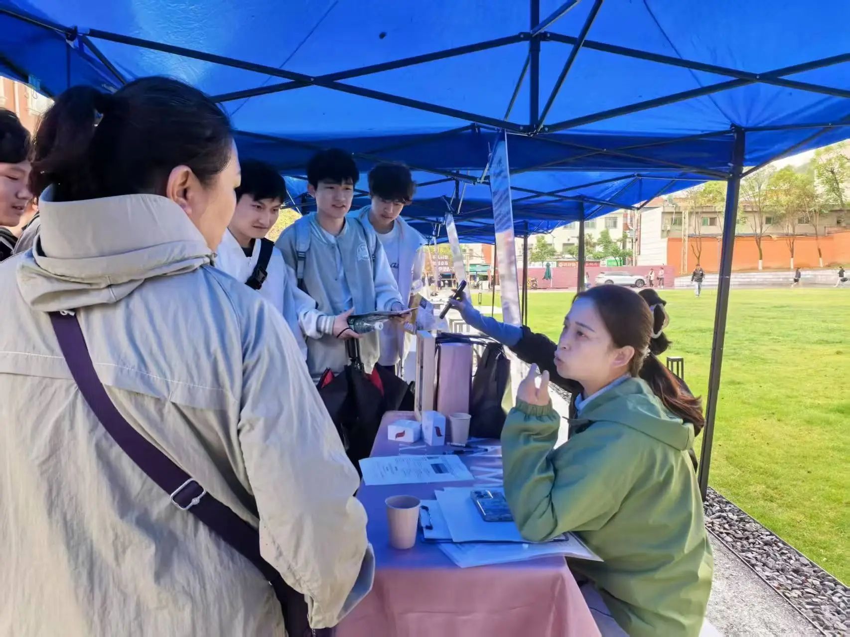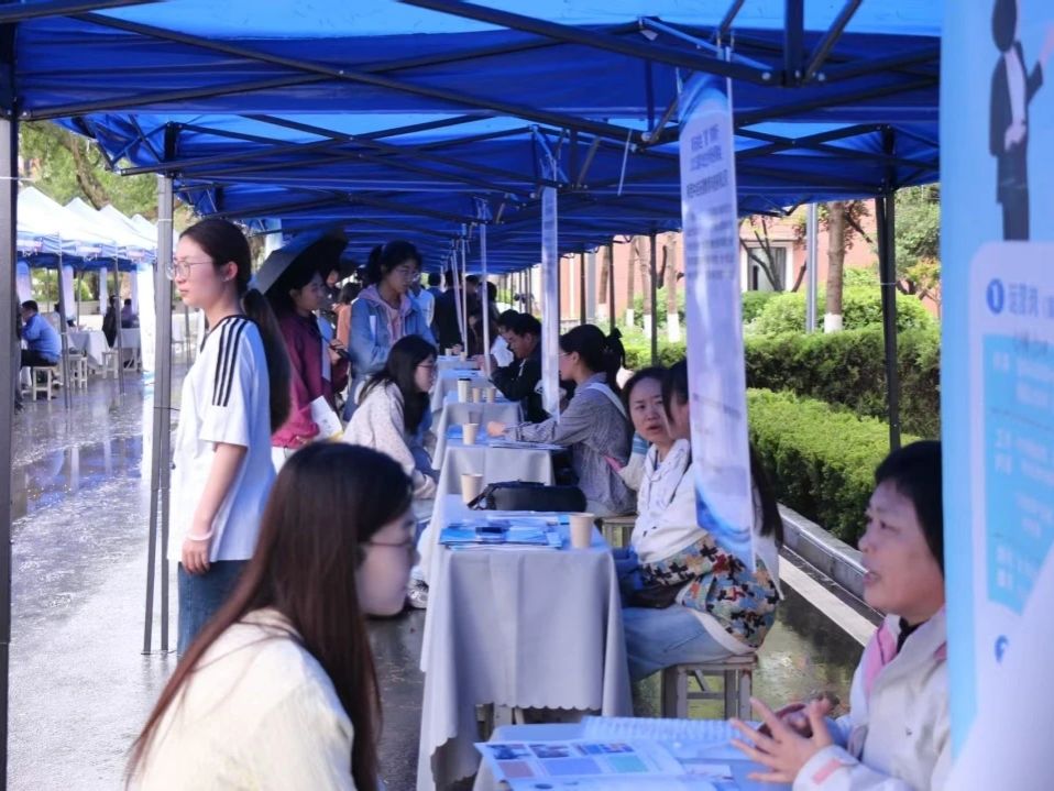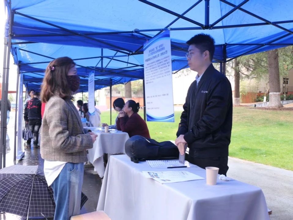本次招聘会聚焦语言类专业特色,岗位涉及教学、涉外项目管理、跨境电商等方向,高度匹配学院小语种专业学生的职业发展需求。雨中,手持简历的毕业生穿梭于各展位前,与企业代表热情交流。