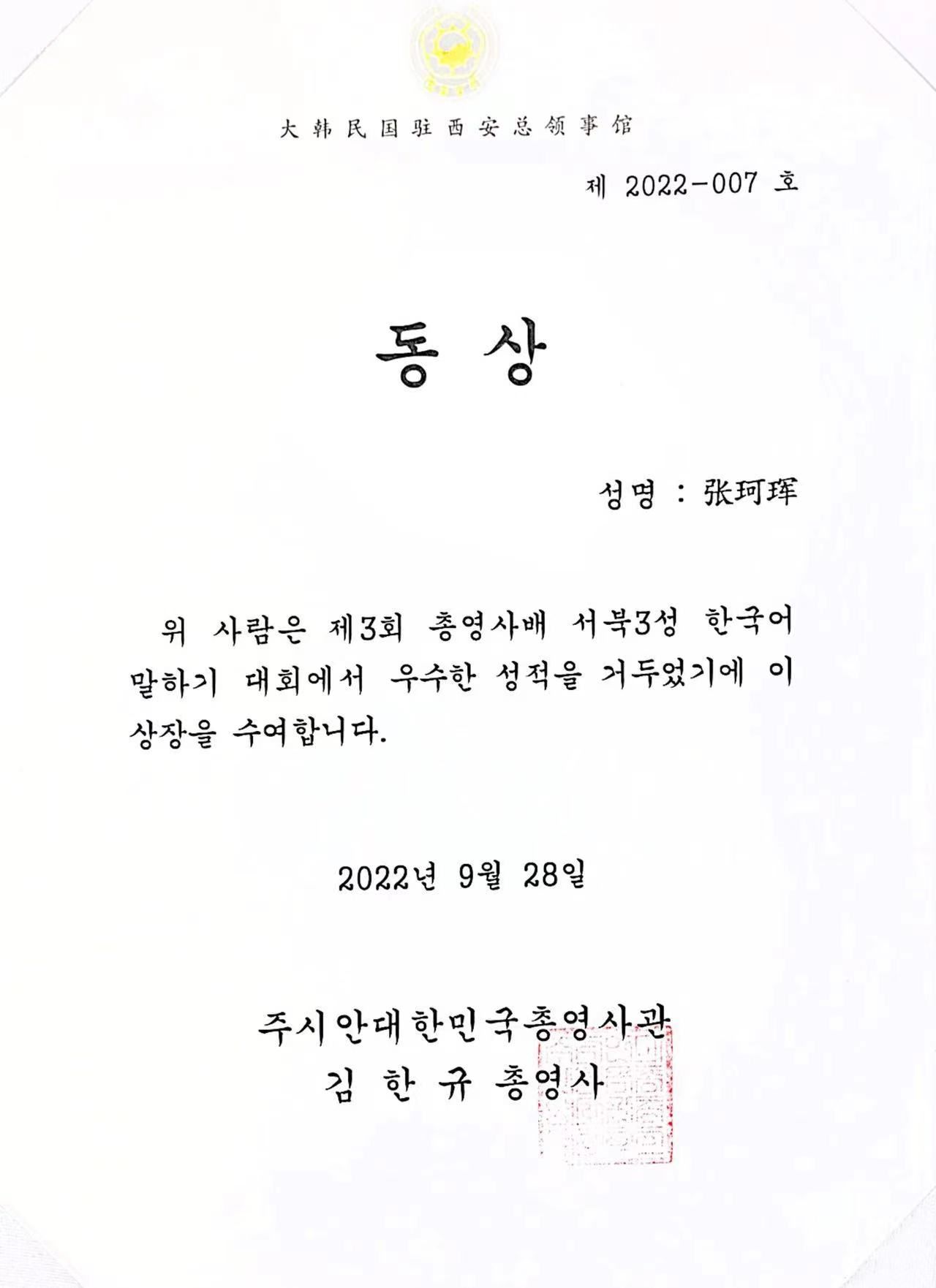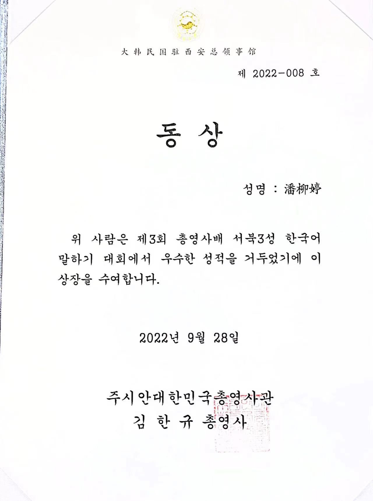近日,由大韩民国驻西安总领事馆主办的第三届“总领事杯”西北三省韩国语演讲大赛在西安成功举办。pp电子游戏平台官网朝鲜语专业2019级四名学生参赛,其中周亦可、张珂珲、潘柳婷包揽铜奖,张嘉祥获得优秀奖。