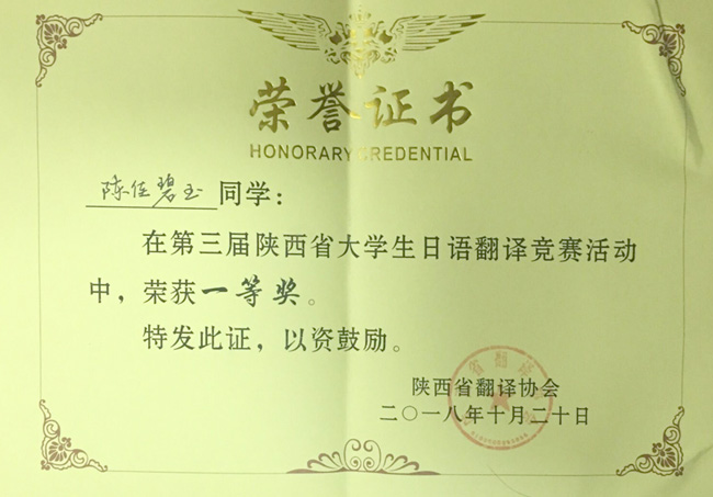 10月20日第三届陕西省大学生日语翻译竞赛决赛在西安文理学院举行,我校pp电子游戏平台官网日语专业2016级陈佳碧玉同学以总分第二名的成绩获得一等奖。