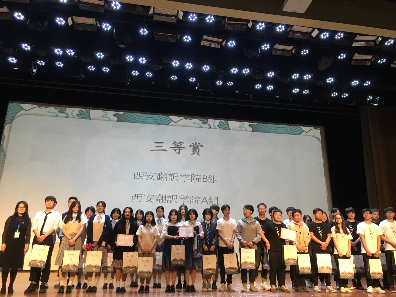 4月21日晚,由西安市日本语教师协会主办的陕西省第十届日语配音大赛圆满落幕!由西安交通大学、陕西师范大学、西安外国语学院、西北大学、西安电子科技大学、长安大学等16所高校组成的18支队伍进行了激烈的比赛。其中,西安外国语大学与我校均各有两组参赛。我校两组队伍出场抽签顺序分别为第六组、第八组。我校两组参赛队伍《强风吹佛》、《轻音》凭借出色的表现赢得现场观众以及评委的一致好评,综合成绩荣获三等奖。