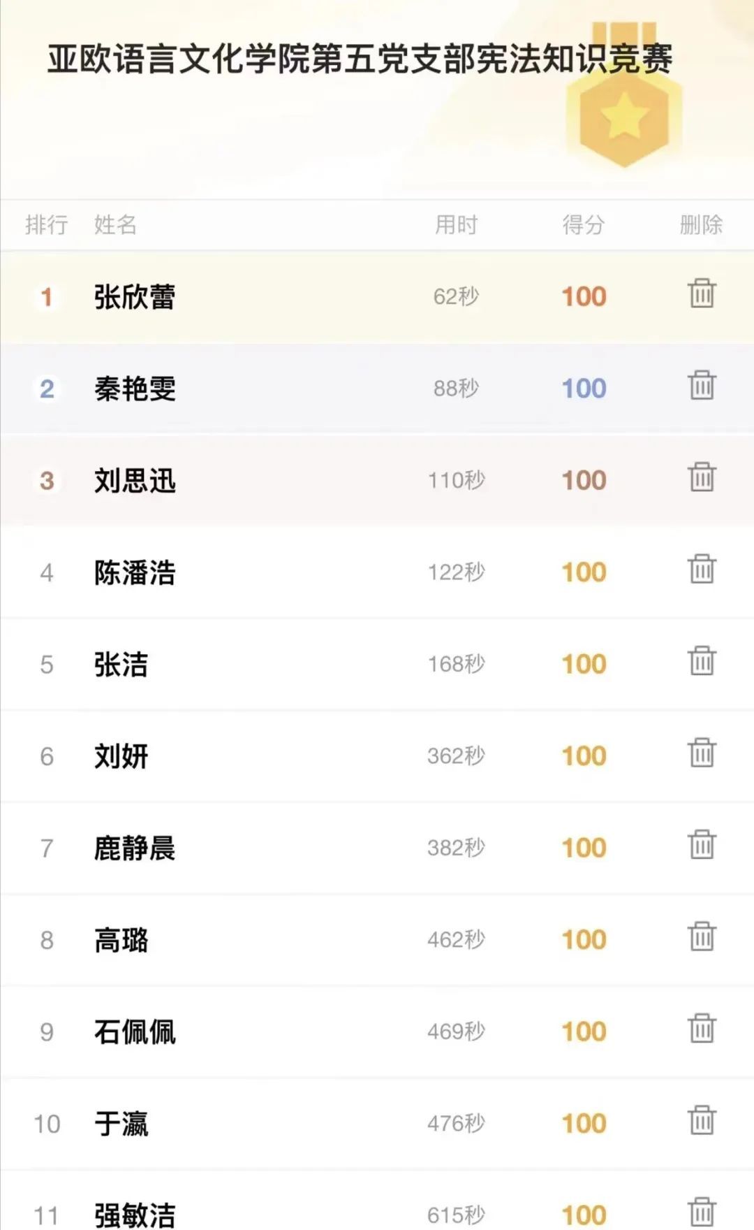此外,pp电子游戏平台官网第五党支部举办宪法知识答题竞赛。本次竞赛旨在加强大学生党员的宪法学习,提高法治素养,让大家更好地了解和运用宪法,为建设法治中国贡献力量,本次知识竞赛参与人数总计89人。截止目前,比赛已经圆满结束,每位同学都取得了十分优异的成绩。在此,我们要向所有参与竞赛的选手表示衷心的感谢和祝贺,你们都是本次竞赛的优秀代表!
