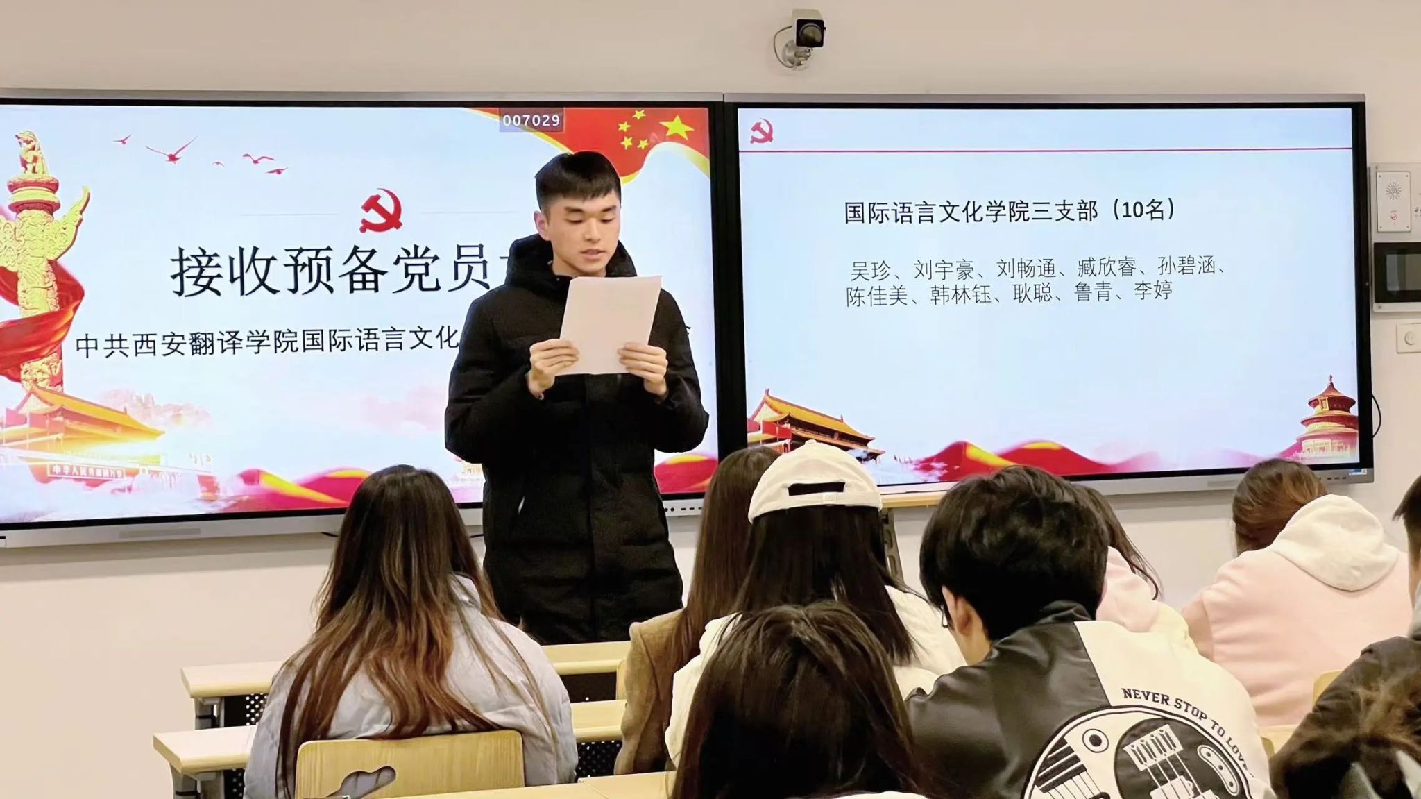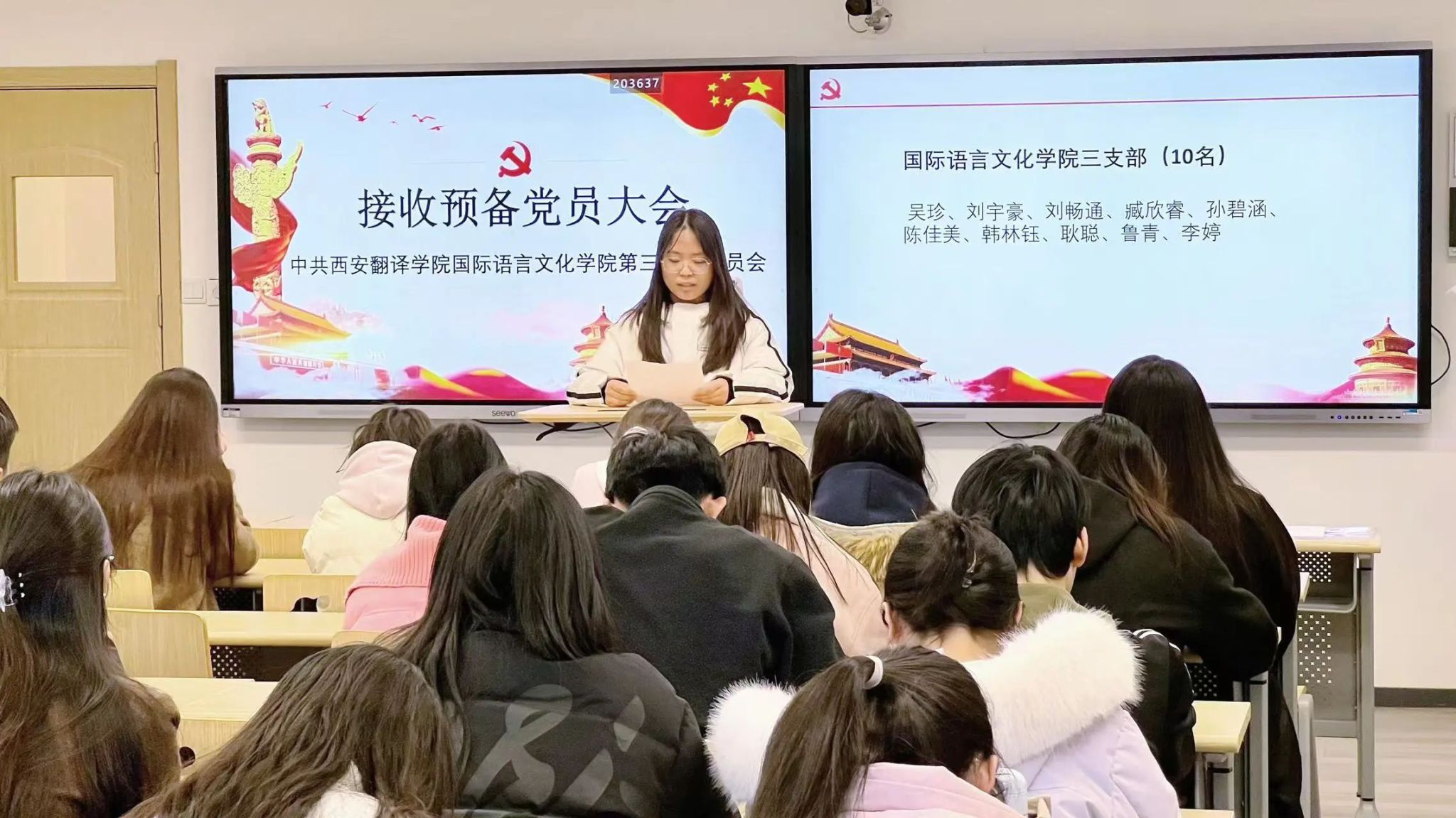 12月2日下午,国际语言文化学院第三党支部在4210M教室召开接收预备党员大会,第三党支部全体发展对象参加会议,第三党支部书记黄丽娜主持会议。