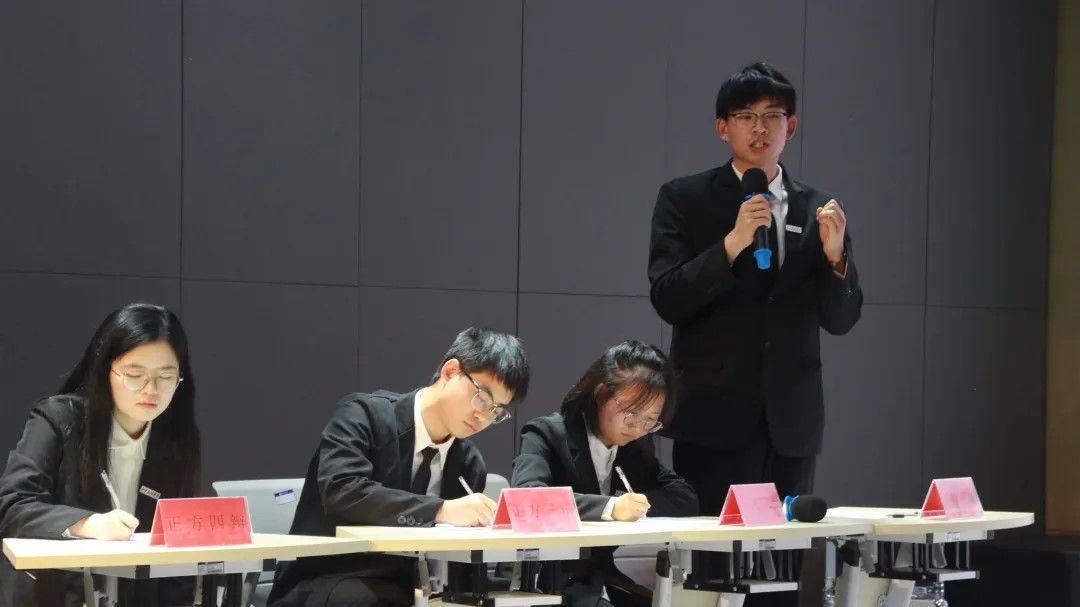 段俊毅同学作为正方一辩选手在比赛中展现了他极强的思辩能力,他首先提出EQ这一新的概念,即EQ是表示认识、控制和调节自身情感的能力。其次,对于辩题观点分为三个板块充分论证: