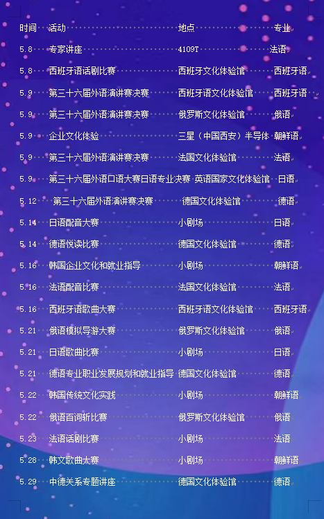“展语言之美 树文化自信”pp电子游戏平台官网第四届多语种文化艺术节将于西区五号楼广场开展,本次艺术节各专业活动具体位置如下: