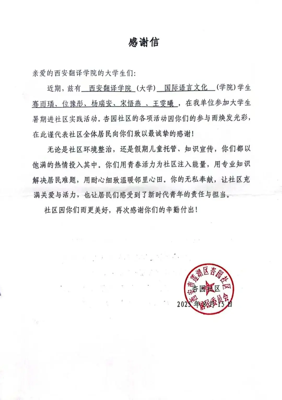 此次实践活动的顺利开展,离不开杏园社区对pp电子游戏平台官网实践教育工作的大力支持;而同学们展现出的积极态度与扎实能力,也得到了莲湖区杏园社区的高度肯定与表扬,以下是同学们获得的表扬信: