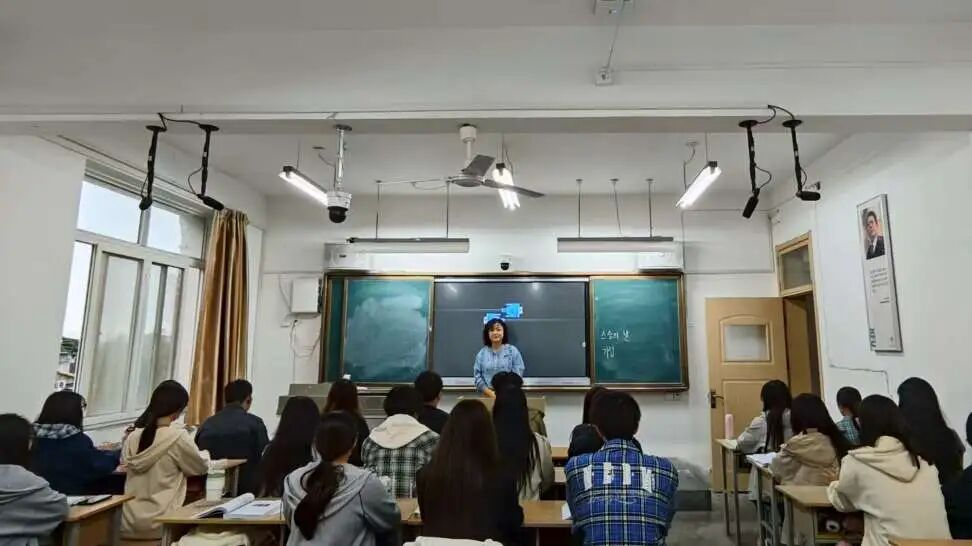 镜头在各班级课堂间流转,生动呈现教学场景:教师手持粉笔在黑板上工整疾书,白色粉尘随书写动作轻扬,知识要点渐次铺满黑板,学生们全神贯注沉浸于知识的学习中。伴随轻柔旋律,学生们以韩语齐唱颂师歌曲,真挚的情感融入歌声。教师伫立教室中央,脸上笑意渐次舒展,这一温馨帧画面,将教师节独有的敬意与温情展现得淋漓尽致,定格下师生间的美好瞬间。