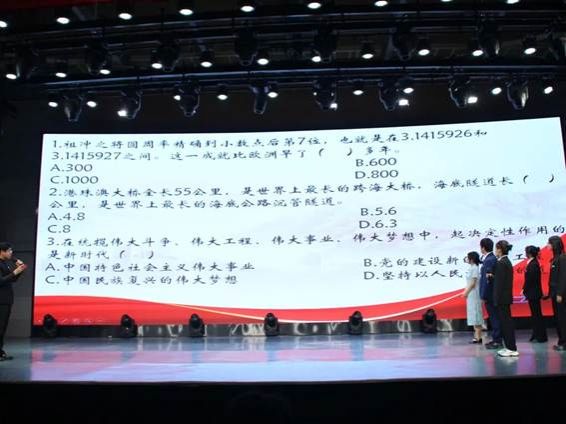在前六位选手完成朗诵后,大赛进入第一轮红色知识竞答环节,问答环节得分计入总分。前六位选手依次登台。题目涵盖党史、抗战史、红色经典等内容,展现出选手们扎实的红色文化素养和敏捷的思维,推动现场氛围走向新的高潮。