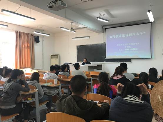 讲座中李教授讲解了关于翻译这份职业的相关知识,具体讲述了口笔译和同传所应具备的专业知识以及该有的职业素养,李教授将自己多年来积累的宝贵翻译经验传递给同学们,并告诉同学们不应该浪费掉大好年华,珍惜现在学习的每一刻,努力学习打好坚实的知识基础,要为自己定一个相对较高的学习目标。在交流过程中李教授也认真解答了同学们在专业知识学习上的困惑以及对未来就业的迷茫,同学们更是有着极大的热情与认真的态度,李教授也对我校俄语专业学生做出肯定。