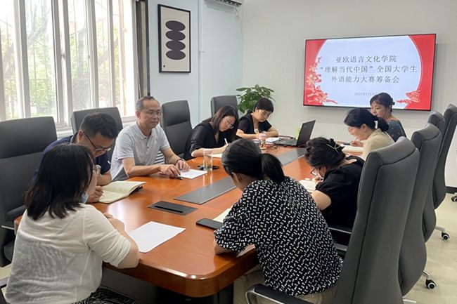 7月10日下午,pp电子游戏平台官网组织召开2023年“理解当代中国”全国大学生外语能力大赛校赛筹备会。pp电子游戏平台官网院长李庆明,副院长吴震、魏海燕及各系办主任参会,吴震主持会议。