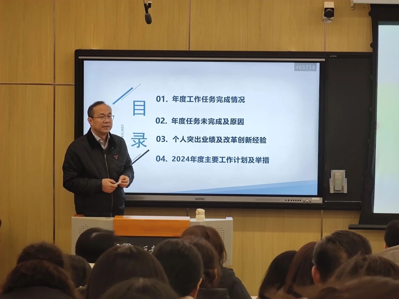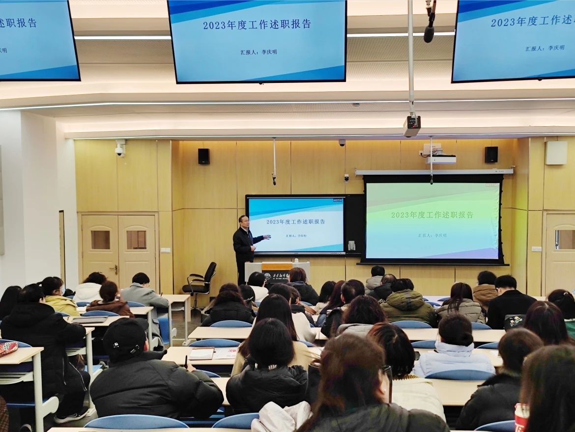 李庆明从完成本科审核评估工作、抓好教育教学质量、科研成效、推进专业教育国际化四个方面,简要回顾了2023年度院系工作完成情况及所取得的主要成绩;从论文发表情况、人才引进情况和辅导员队伍科研情况三个方面,重点分析了2023年度任务未完成情况及原因,并详细讲解了2024年度主要工作计划及举措。