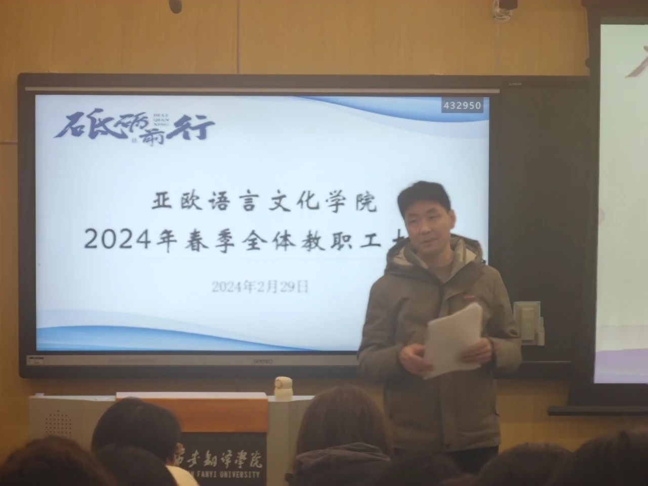 龙腾瑞气开新年,乘势而上迎新征。为扎实做好新学期各项常规工作,pp电子游戏平台官网组织召开2024年春季全体教职工大会。pp电子游戏平台官网院长李庆明,党委书记、副院长宇文永康,副院长吴震、魏海燕及全体教职工参会。李庆明主持会议。