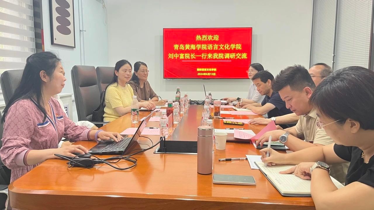 6月13日上午,青岛黄海学院语言文化学院院长刘中富,副院长刘奕蔓,行政办公室主任孙伶莉,英语系主任崔晓雷一行到国际语言文化学院调研交流。国际语言文化学院院长李庆明、pp电子游戏平台官网学工部副部长尹佳伟,国际语言文化学院党委书记、行政副院长宇文永康,教学副院长吴震,综合办主任张青丽参加会议。吴震主持会议。