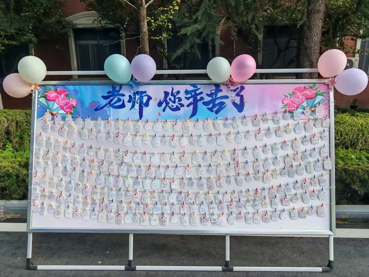 在这个充满温情与敬意的九月,学院1200多名学生,怀着感恩的心,利用自己专业的语言,在精美的小卡片上写下自己内心最诚挚的祝福,每一张贺卡都承载着学生对教师最真挚的情感。随后,学院收集所有卡片并悬挂在宣传板上,在三号楼门前进行展示。
