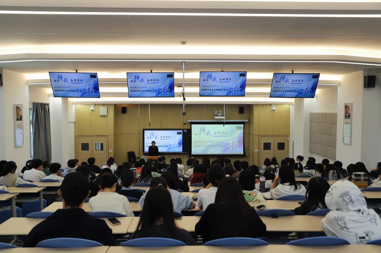 为进一步提高人才培养质量,夯实优良学风建设基石,充分调动学生的考研积极性,10月10日下午,国际语言文化学院举行“时不待我,奋楫前行”2025届毕业生考研经验分享会。海文考研陕西第一分校校长张萌飞,中国顶级考研辅导专家、海文考研王蒙,国际语言文化学院院长李庆明,党委书记、副院长宇文永康,副院长吴震、魏海燕,综合办主任张青丽,学工办主任尹娜出席会议。国际语言文化学院2025届和2026届意向考研的学生参会。国际语言文化学院学生吴宗磊主持会议。