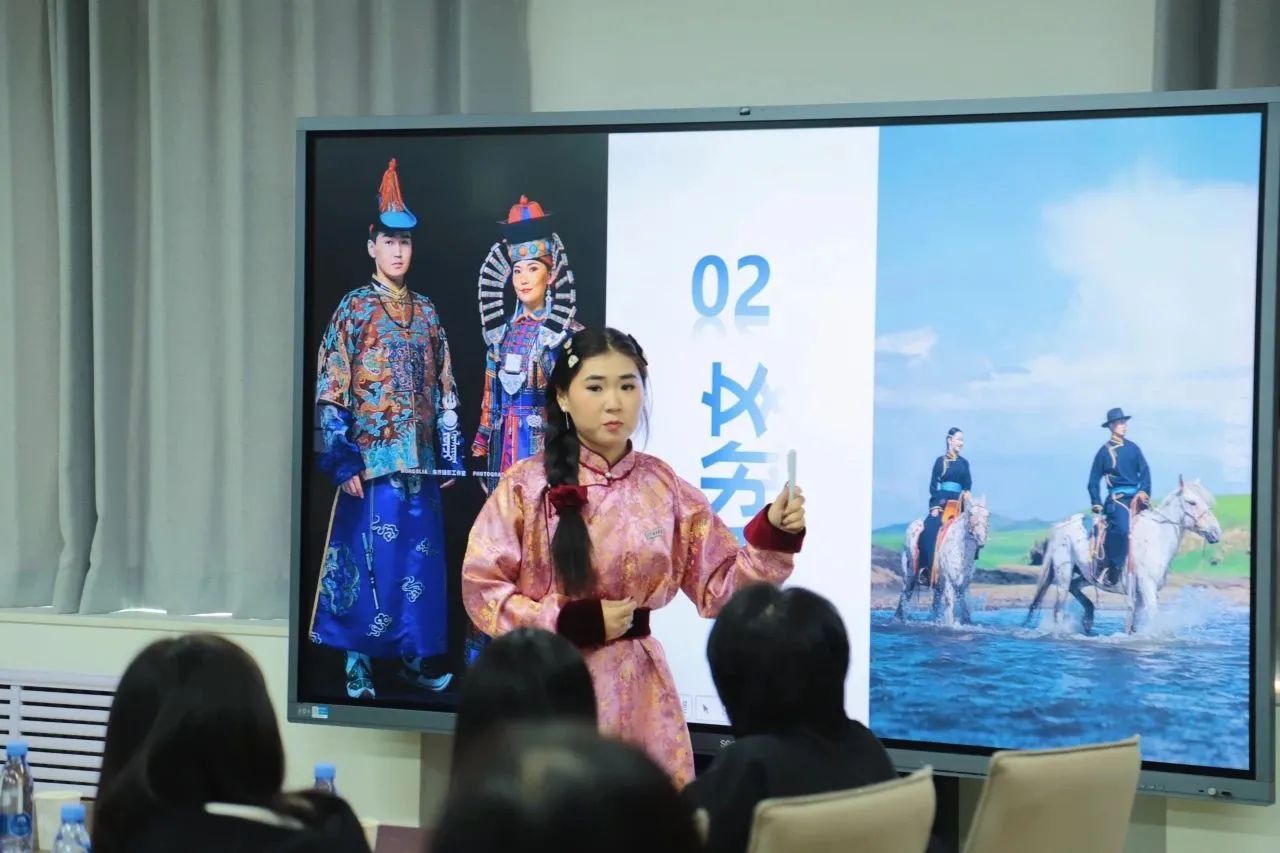 同学们还详细介绍了各自民族的传统文化、建筑特色以及民族历史,让在场师生领略到了不同民族文化的独特韵味,增进了大家对多元文化的理解和尊重。其中,来自蒙古族的额格喜格身穿传统民族服装,犹如一位从草原走来的使者,用当地民族语言深情地唱起了《摇篮曲》。她悠扬的歌声,瞬间将全场师生带到了辽阔的草原上。演唱结束后,额格喜格还为大家讲解了这首歌曲背后的感人故事,展示了蒙古族人民对于家庭和亲情的深厚情感,引来阵阵掌声和赞叹声。这一刻,民族文化的魅力在每个人的心中悄然绽放。
