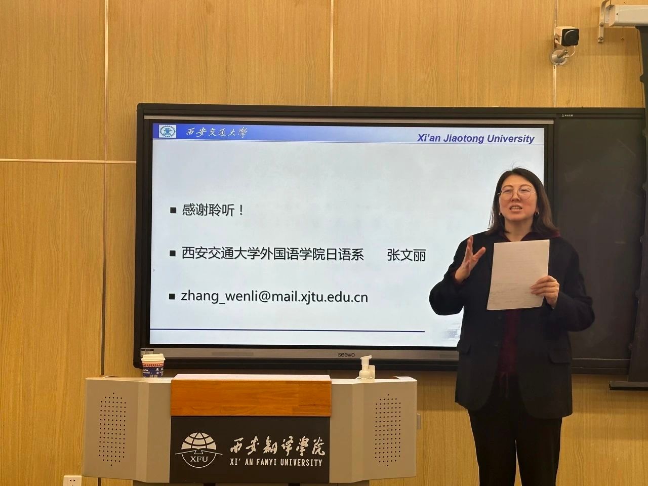 讲座中,张文丽教授介绍了西安交通大学“大学日语”系列国家级一流课程建设的核心理念,并分享了她在SPOC模式下的公共外语课程混合式教学中的实际应用。她深入剖析了如何在课程中引入多种在线学习资源,构建系统的评价指标,并结合实际教学经验,探讨了提升学生在线学习效果的有效方法。张文丽教授强调,教学模式的创新不仅需要技术支持,更需要教学者对教学内容和目标的深入理解。