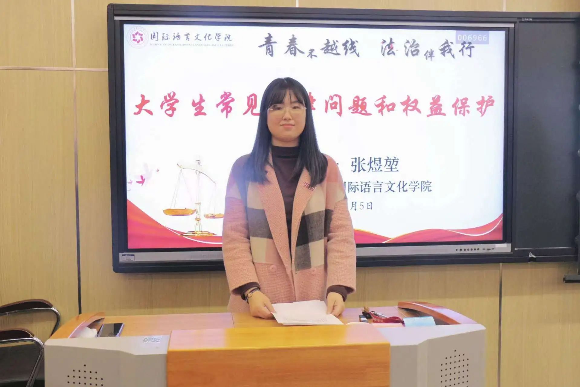 张煜堃对劳动法进行了全面概述,详细解释了《中华人民共和国劳动法》《劳动合同法》等法律法规的构成,明确指出了劳动关系与劳务关系的区别,阐述了劳动关系和劳务关系在适用法律、劳动主体、主体关系、责任承担等方面的不同。在劳动者权益方面,他特别强调了劳动者的主要权利,包括工作时间、劳动报酬和社会保险福利待遇等。同时,张煜堃结合实际案例,深入解读了帮助信息网络犯罪活动罪的法律条文和司法解释,警示学生们要提高警惕,避免因一时的贪念而触犯法律。
