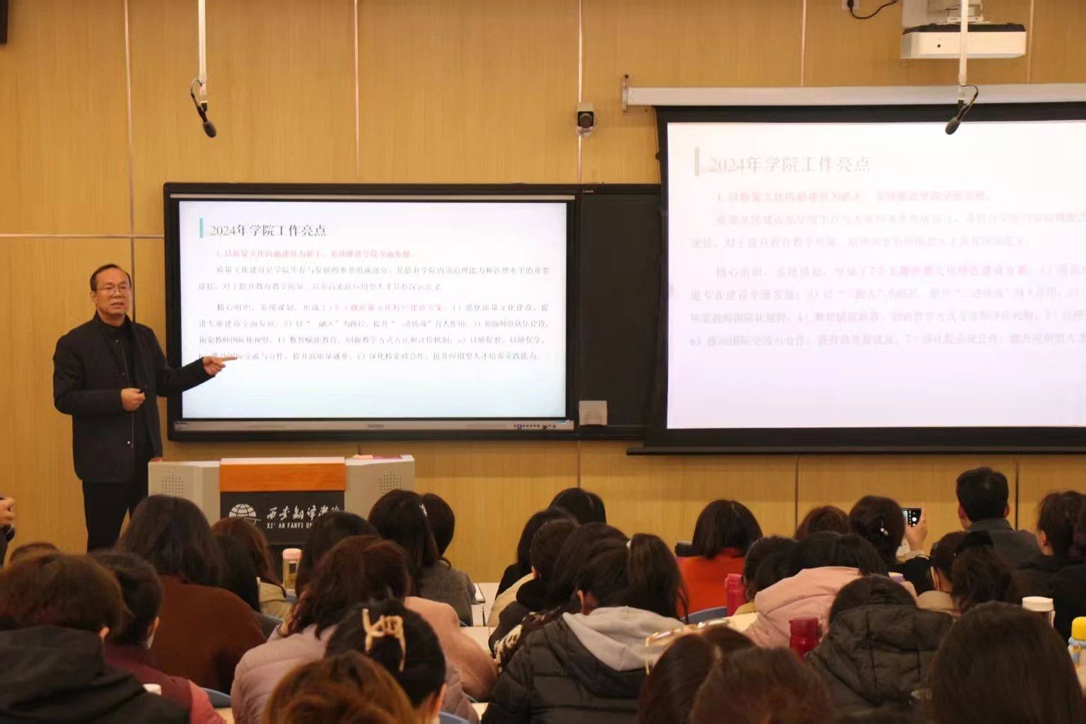 2月28日下午,国际语言文化学院召开2025学年春季学期全体教职工大会,旨在全面总结2024年工作,部署2025年重点工作。学院党委书记、副院长宇文永康主持会议,学院领导班子成员及全体教职工参加会议。