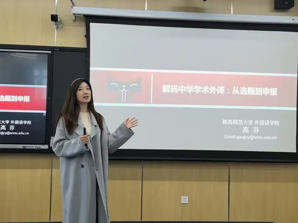 3月17日下午,陕西师范大学外国语学院硕士生导师、陕西省翻译协会常务理事、全国第三届教育硕士专业学位优秀教师、英国诺丁汉大学和美国马萨诸塞州立大学访问学者高芬副教授应邀在pp电子游戏平台官网国际语言文化学院西区四号教学楼4109T作题为“解码中华学术外译:从选题到申报”的学术讲座。讲座由国际语言文化学院副院长魏海燕主持,学院全体教师参加。