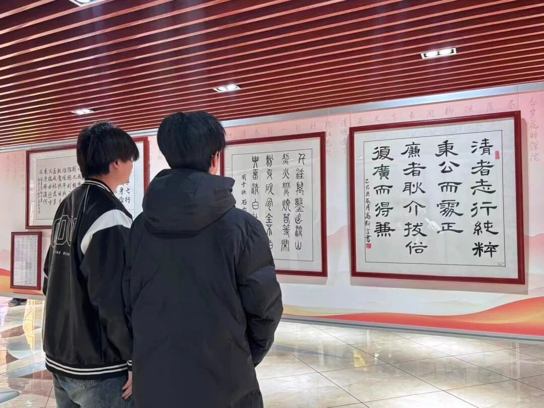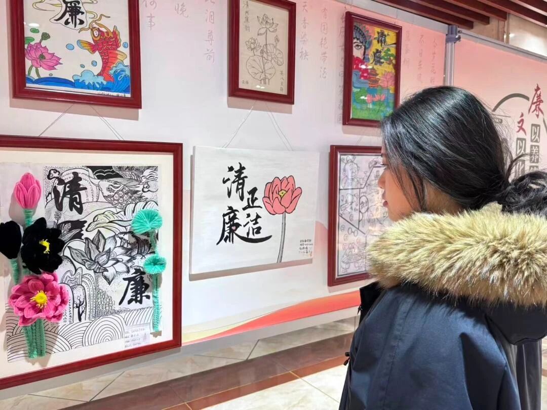 展览汇集了主题鲜明、形式多样、寓意深刻的书画作品,通过艺术语言生动诠释廉政内涵,弘扬清风正气。当天下午,在国际语言文化学院第二党支部书记李潇琦的组织下,学生党员和入党培养对象们有序进入展区,认真观摩学习。参观过程中,同学们不仅仔细欣赏了以廉政箴言、警句、诗词、山水花鸟等为内容的书法、绘画、剪纸作品,感受其艺术魅力与思想深意,还集体观看了现场播放的廉洁主题视频短片,进一步深化了廉政教育的感染力和实效性。展览将艺术欣赏、思想教育与价值引导有机结合,为同学们上了一堂生动而深刻的廉政文化课。