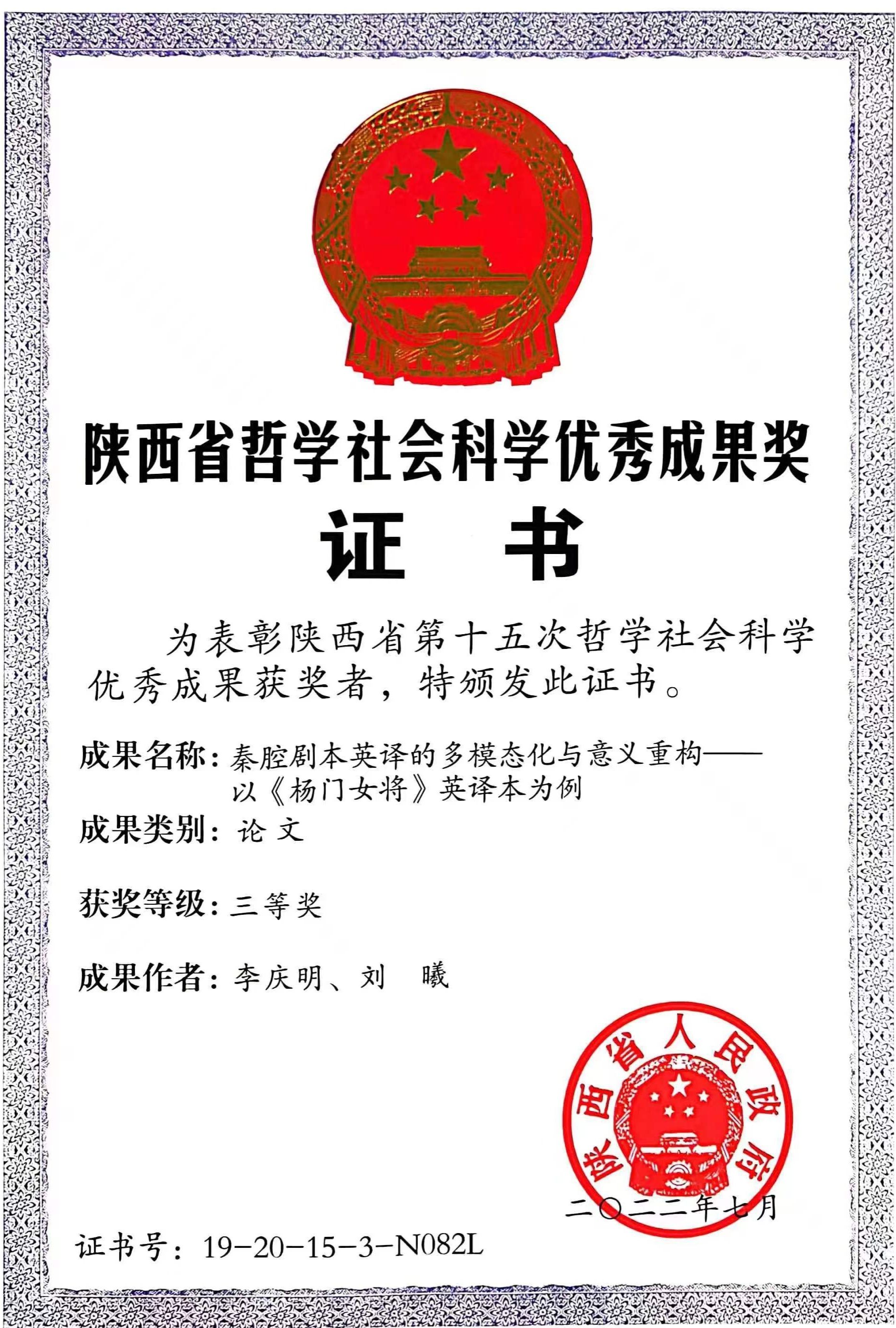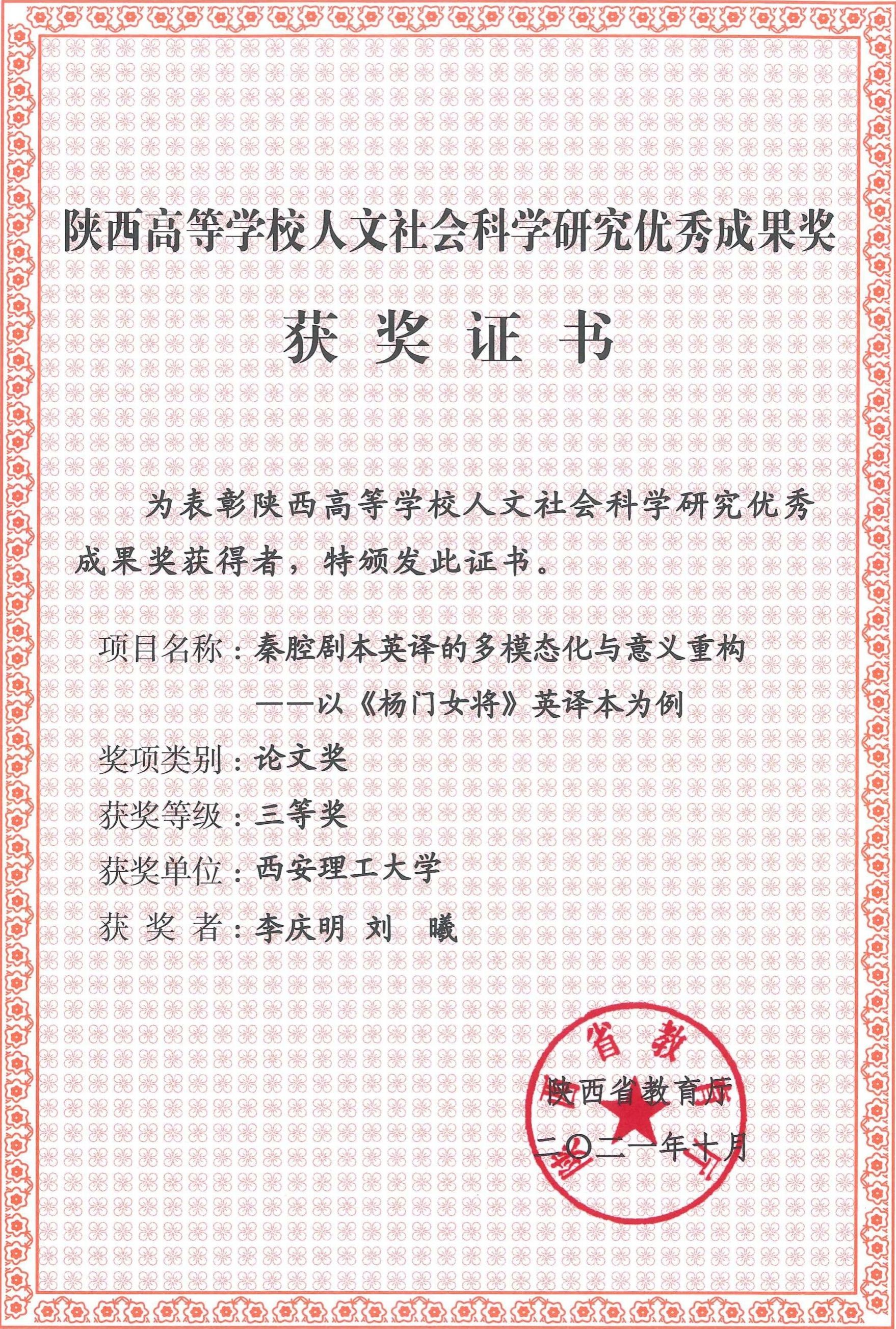 2.秦腔剧本英译的多模态化与意义重构--以《杨门女将》英译本为例,陕西省哲学社会科学研究优秀成果三等奖(论文),2021年;