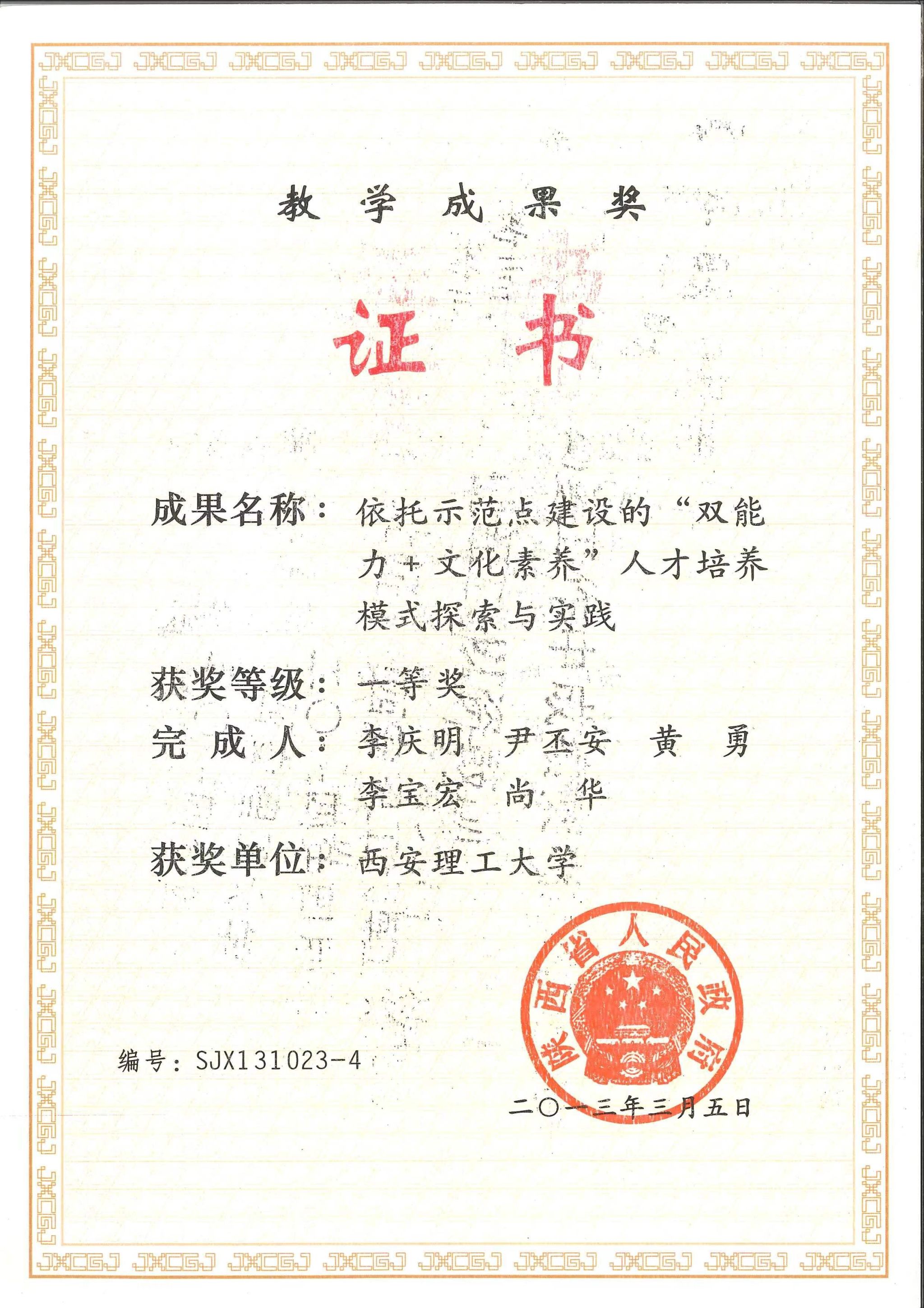 1.依托示范点建设的“双能力+文化素养”人才培养模式探索与实践,陕西省教学成果奖一等奖,主持人,2013;