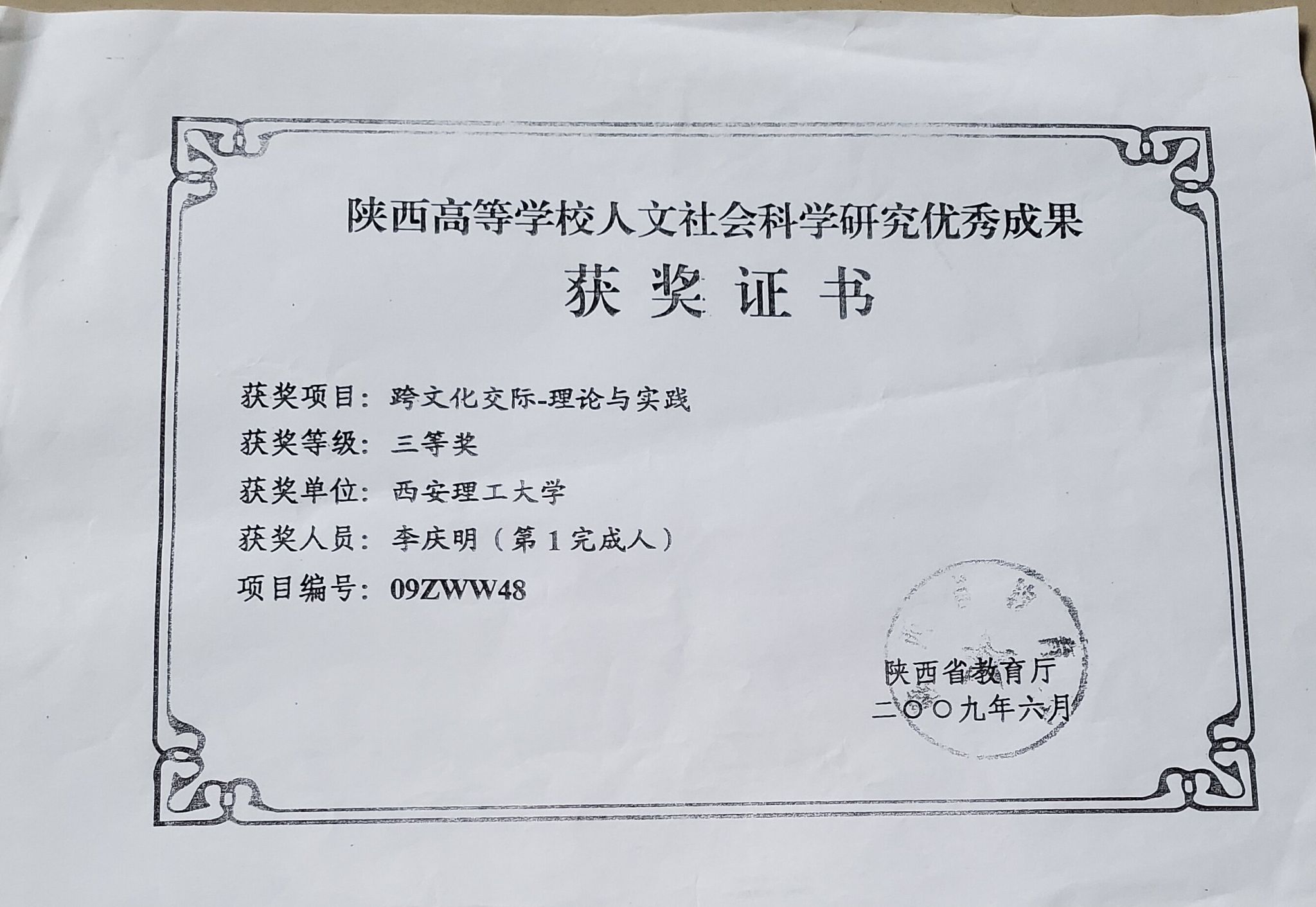 7.《跨文化交际--理论与实践》,陕西高等学校人文社会科学研究优秀成果三等奖(著作),2009;