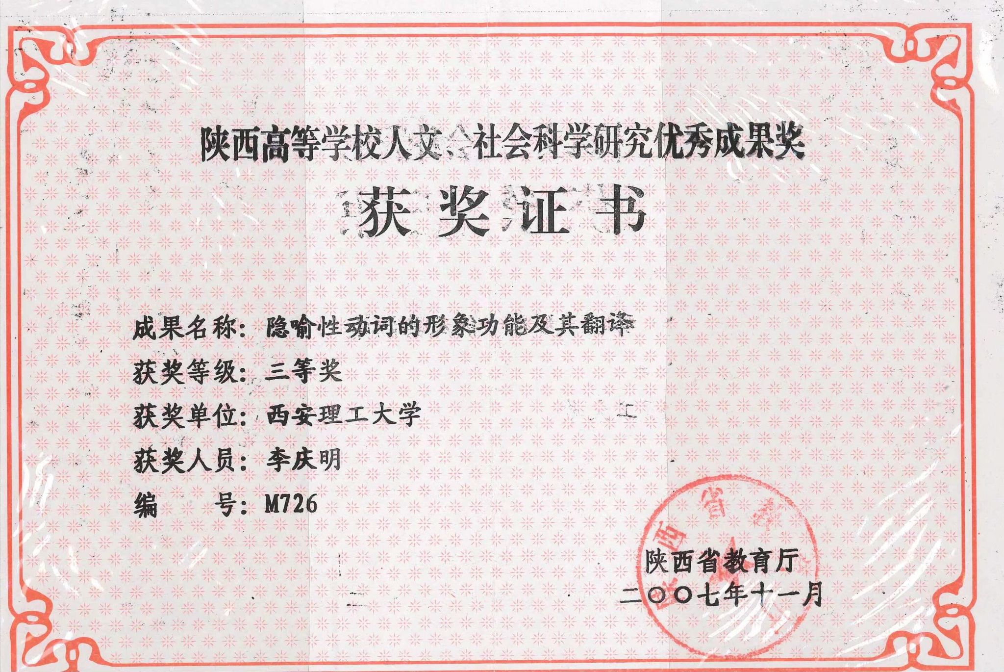 8.隐喻性动词的形象功能及其翻译,陕西高等学校人文社会科学研究优秀成果三等奖(论文),2007;