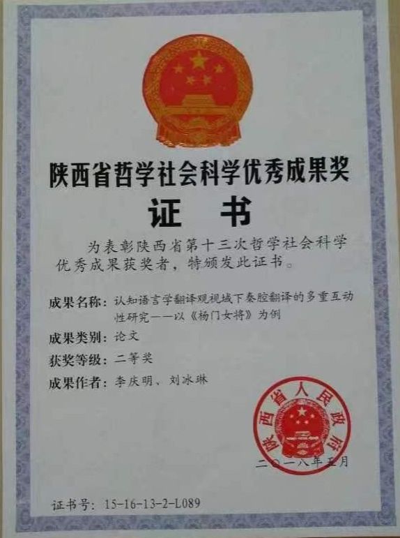 1.认知语言学翻译观视域下秦腔翻译的多重互动性研究--以《杨门女将》为例,陕西省哲学社会科学优秀成果二等奖(论文),2018年;